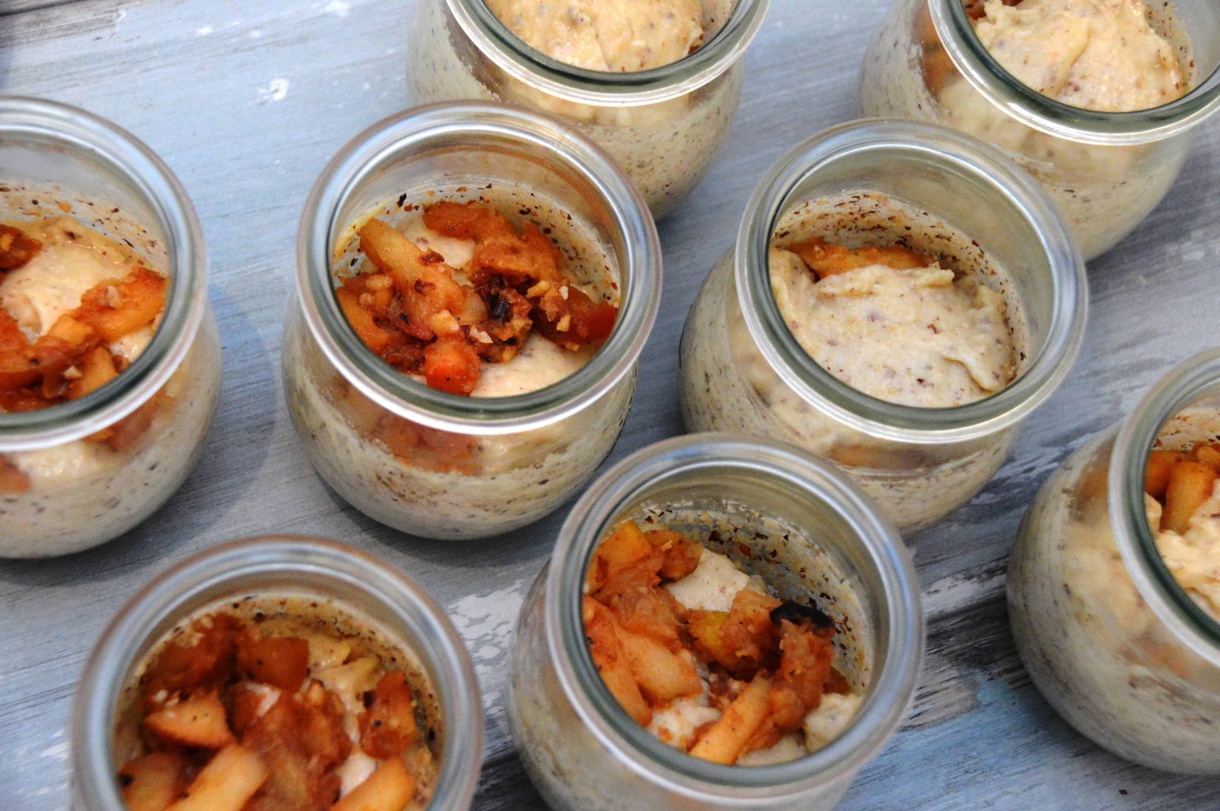 Nun können die Gläser gefüllt werden. Ich habe mich einmal für einen dreischichtigen Aufbau (Teig-Apfel-Teig) und eine Vier-Schichten-Variante (Apfel-Teig-Apfel-Teig) entschieden.