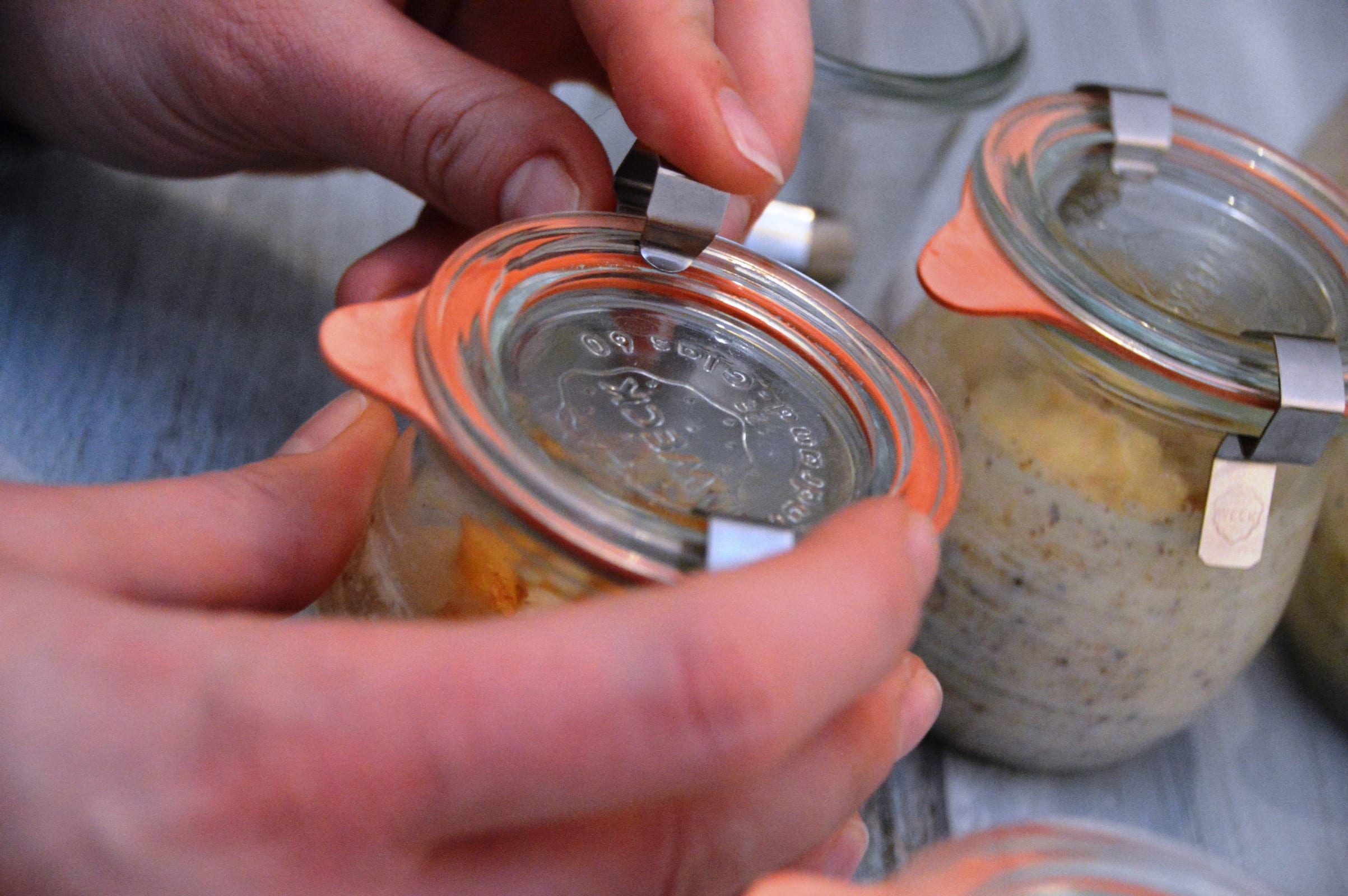 Zuerst wird der Glasrand nochmal gründlich gereinigt, am besten mit warmem Wasser und etwas Küchenrolle. Die Gummis werden auf dem Deckel in Position gebracht, die Deckel werden aufgelegt und mit den Klammern fixiert.