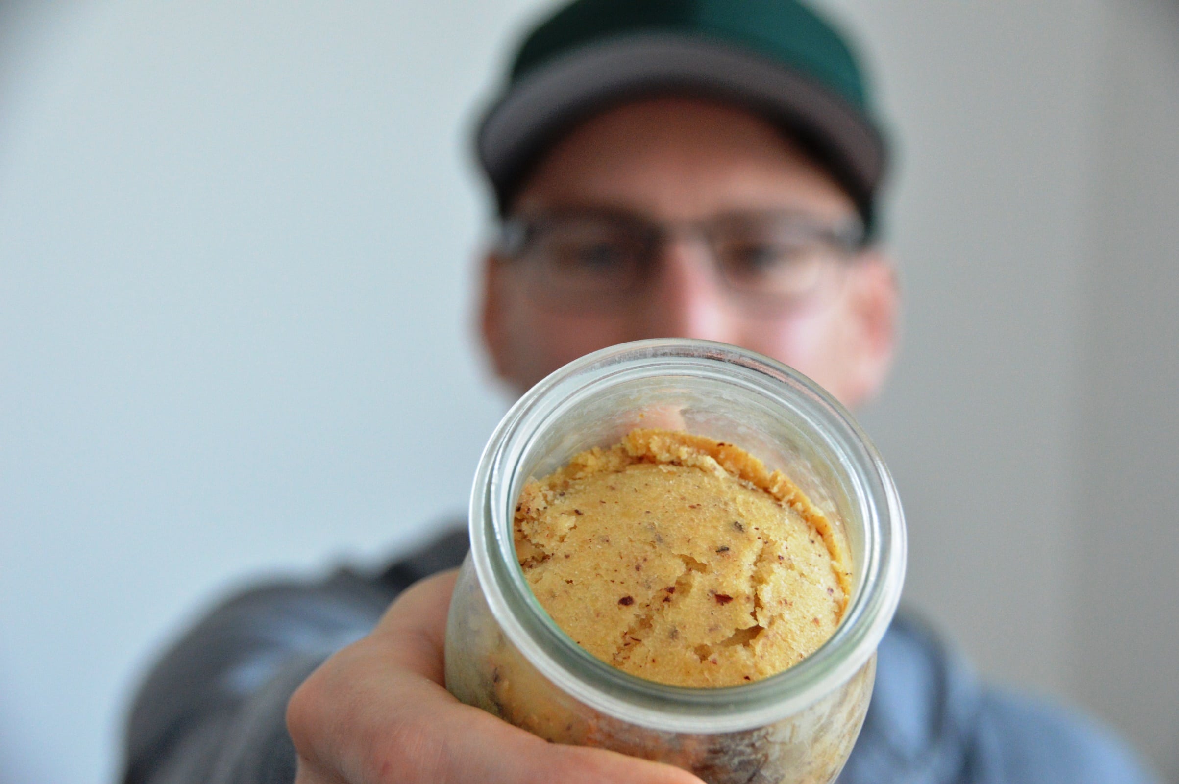 Alle Zutaten landen in einer kleinen Rührschüssel, die Tonkabohne wird mit einer Muskatreibe eingearbeitet – Je feiner sie gemahlen ist, desto angenehmer und gleichmäßiger ist auch später das Aroma, das in Kombination mit den Haselnüssen dem eingekochten Kuchen seinen winterlichen Touch gibt. Wer nicht auf eine lange Haltbarkeit von mehreren Monaten aus ist, kann das Wasser natürlich mit leckerer Vollmilch ersetzen. ;-) Dann werden alle Zutaten in weniger als zwei Minuten zu einem glatten Teig verarbeitet, bis sich alle Butterflocken aufgelöst haben.