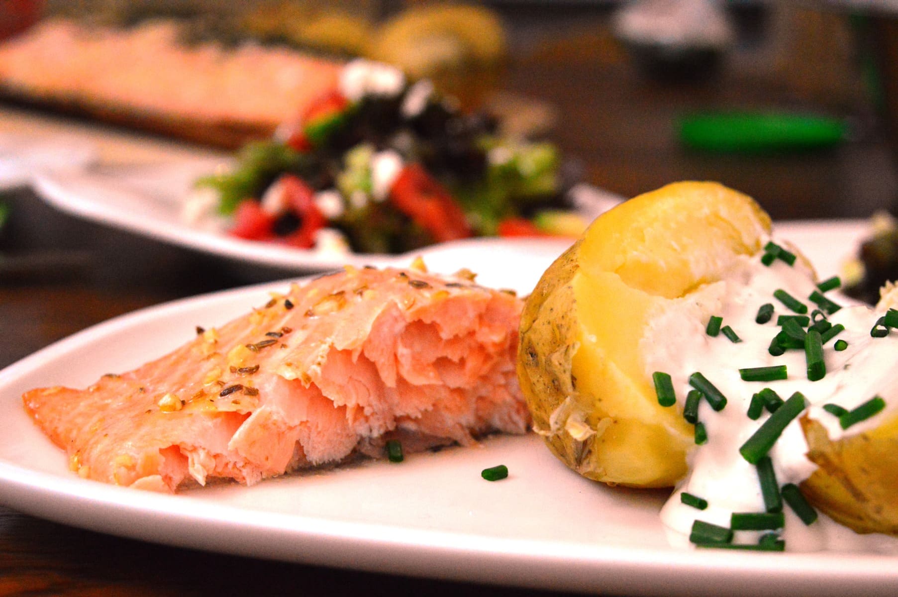 Zusätzlich zum köstlichen Lachs von der Planke gab es Grillkartoffeln und Sour Cream, sowie einen kleinen Salat. Der Fisch hat einen kräftigen Eigengeschmack, das austretende Fischeiweiß ist der Wahnsinn – Super lecker! Die Aromen von Zeder, Fenchel und Koriander harmonieren toll miteinander, geschmacklich sehr interessant ist die fruchtige Marinade aber auch durch den süßen Honig. Optisch ein Hingucker, geschmacklich ein absolutes Highlight: Lachs auf der Planke ist ein wirklich tolles Gericht. Probiert’s aus! ;-)