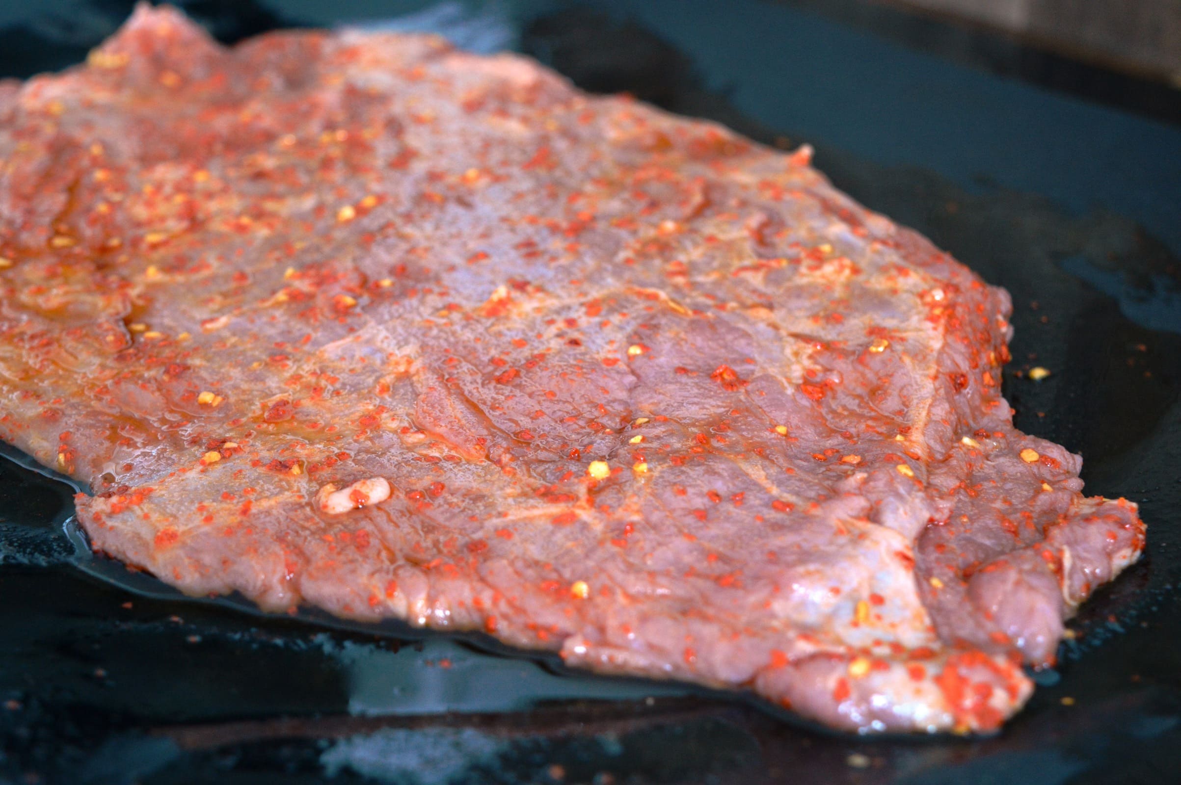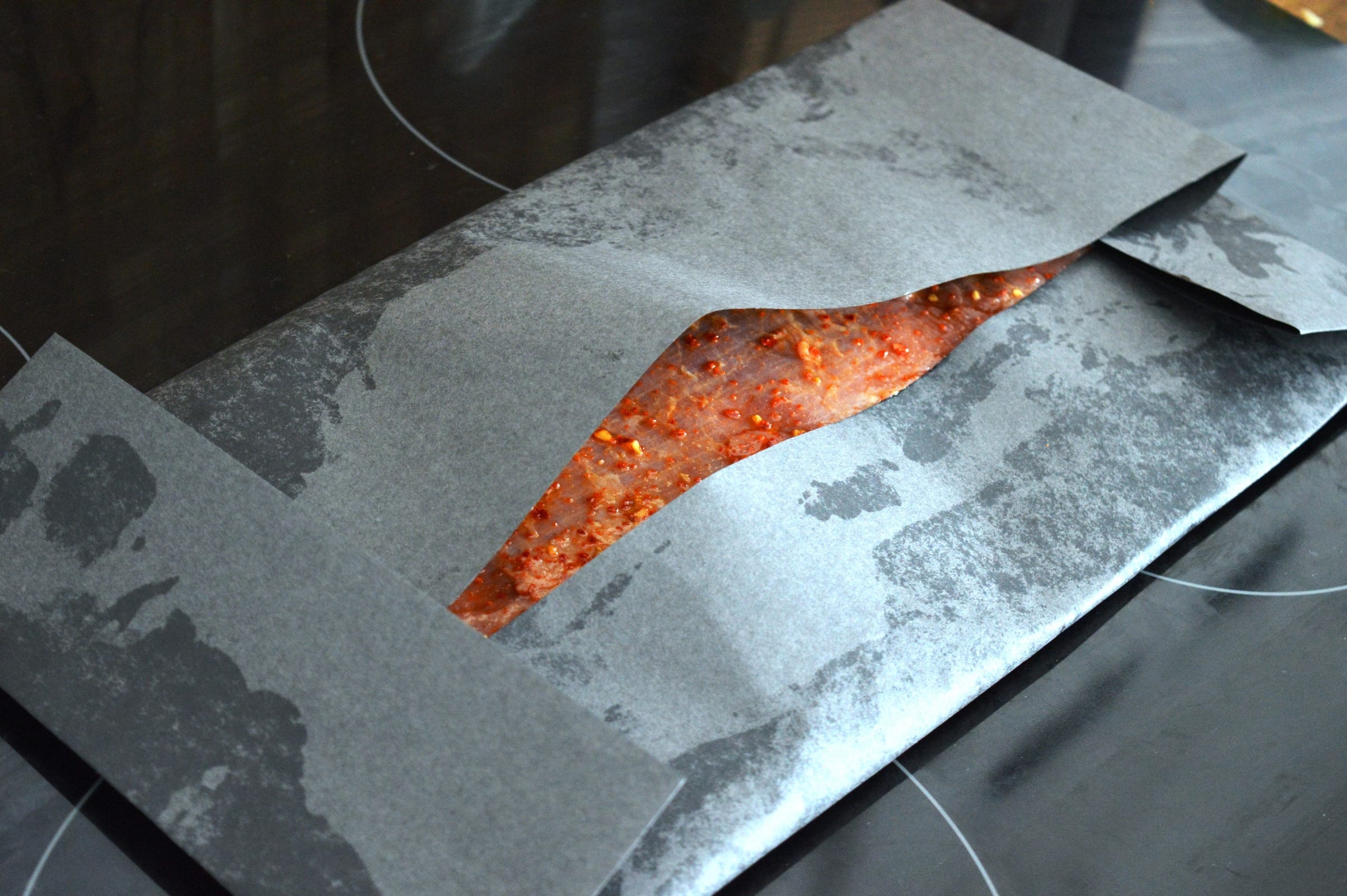 Nach Ölkur kommt dann die Würzung, z.B. ein Rub, passend zu Rindfleisch. Ich habe eine schnelle Gewürzmischung aus Chili, Zitronenabrieb, Knoblauchpulver, Zwiebelpulver, Salz und Zucker verwendet, es gibt aber auch tolle Mischungen von Don Marcos Barbecue. Der Rub wird reichlich von beiden Seiten aufgetragen, dann wird das “Paket” verschlossen. Ich hatte insgesamt drei große Lagen schwarzes Metzgerpapier, in die ich das Fleisch gehüllt habe, sodass möglichst wenig Feuchtigkeit entweichen kann.
