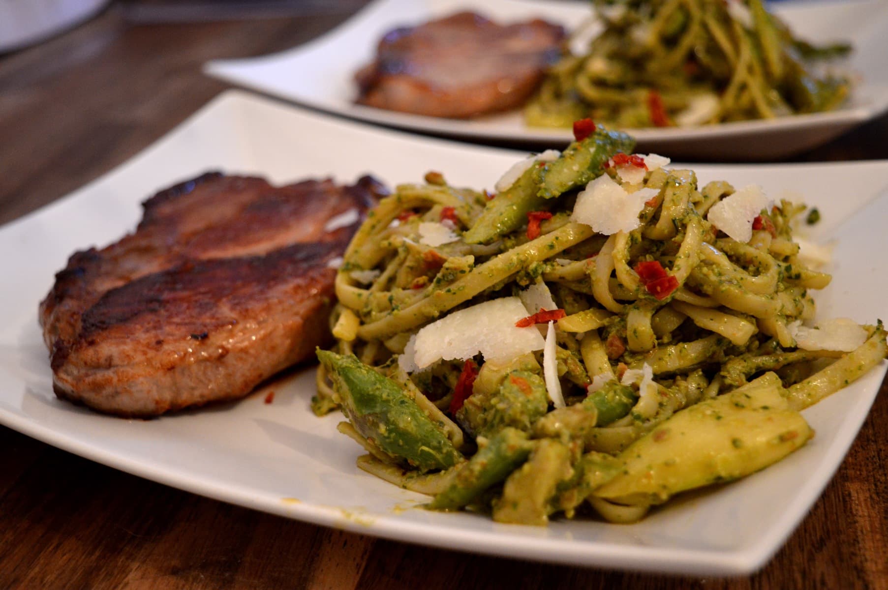 Potsdamer Sauenhain Nackensteaks und Nudeln mit Rucola-Pesto und SpargelZusammenfassend sind ausnahmslos alle, die von den Potsdamer Sauenhain-Produkten gegessen haben, total überzeugt gewesen. Das schließt mich ein, ich kann das Fleisch aus voller Überzeugung empfehlen. Ich habe selten so gute Qualität auf dem Teller gehabt, das aus fast schon utopisch schönen Haltungsbedingungen stammt. Das schmeckt man auch, der reine Fleischgeschmack wird in jedem Fall auch Leuten zusagen, die sonst nicht so gerne Schwein essen. Die Marmorierung war im Karreestück super ausgeprägt, was das Fleisch sehr saftig gemacht hat. Ich kann aus der Ferne, weder in der Zucht noch im weiteren Verarbeitungsprozess Mängel feststellen und saß als Kunde nach jedem Gericht richtig zufrieden am Tisch – Das Fleisch macht glücklich, und bei dem Preis/Leistungsverhältnis kann man bei der Qualität auch nicht meckern. Die Boxen vom Potsdamer Sauenhain sind absolut empfehlenswert. :)