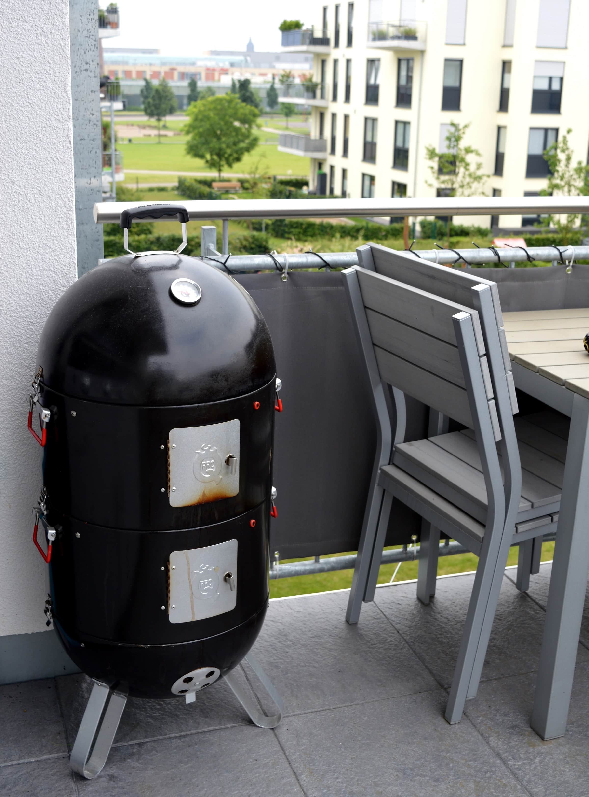 Zusätzliche Stacker kann man für unter 90,- EUR z.B. bei Amazon bestellen, so sind (übrigens alle proQ-Modelle) stetig erweiterbar und der Smoker kann in ungeahnte Höhen gebaut werden. ;-) Ein großer Vorteil ist für mich aber die Möglichkeit, den Garraum zu verkleinern: Dadurch passt der voll funktionale Watersmoker nämlich stehend in unseren Kofferraum. Seitlich passt noch eine Kühlbox für Fleisch und Getränke – Was will man mehr? ;-)