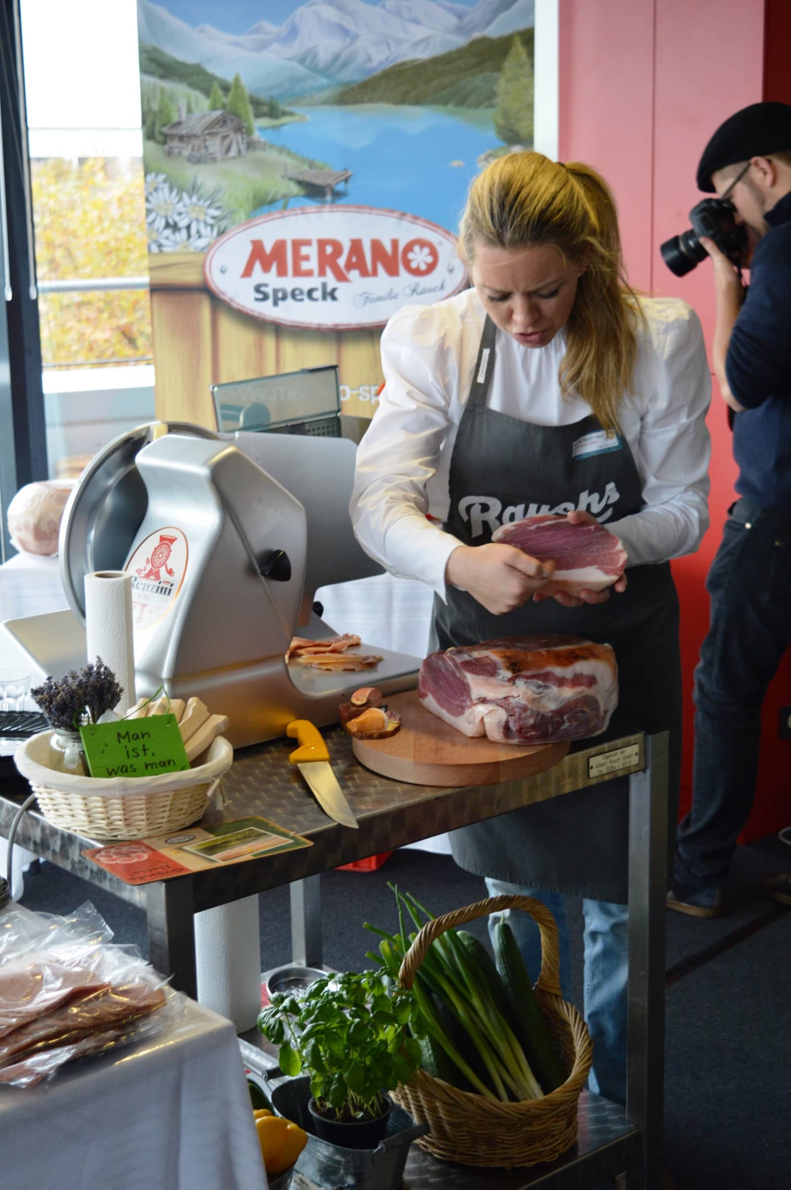 Nach der lieben Begrüßung durch die guten Seelen der Agentur Seidl gab es erstmal ein paar Informationen über den Tagesablauf. Dann ging es auch sofort ins Thema: Die Herstellung und Veredelung von Salami wurde uns von Ingmar Rauch, Mitinhaber der R&S Spezialitäten GmbH, erklärt. R&S führt in Deutschland etliche bekannte Marken wie Aoste, Chateau Boeuf und viele andere. In seinem kurzen, aber lustigen Vortrag fand ich insbesondere die Thematik um die Schimmelreifung sehr interessant, da dreht sich mit LUMA (in Sachen Rindfleisch) ja gerade in Deutschland auch einiges.