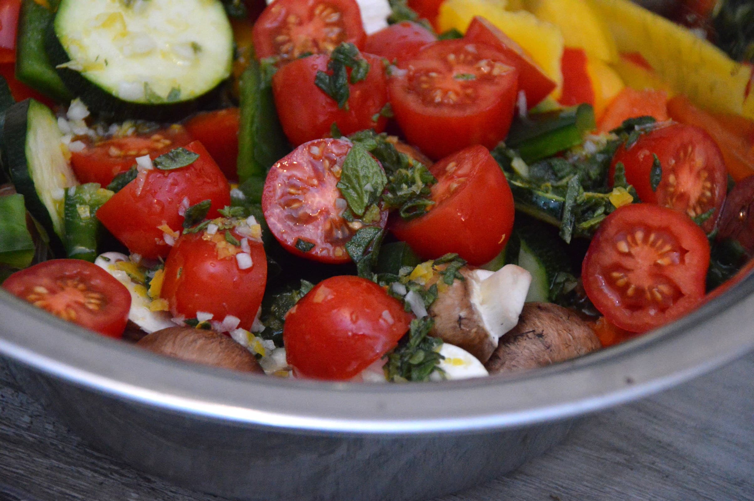 Am besten bereitet man zuerst das Öl vor. Dazu werden zuerst die Knoblauchzehen fein gehackt und ins Öl gegeben. Dazu kommt der Pfeffer, Abrieb und Saft einer Bio-Zitrone, sowie das kleingehackte Oregano und der Rosmarin. Bestenfalls zieht das Öl eine Stunde, bevor der Grillsalat rund 30 Minuten mariniert wird.