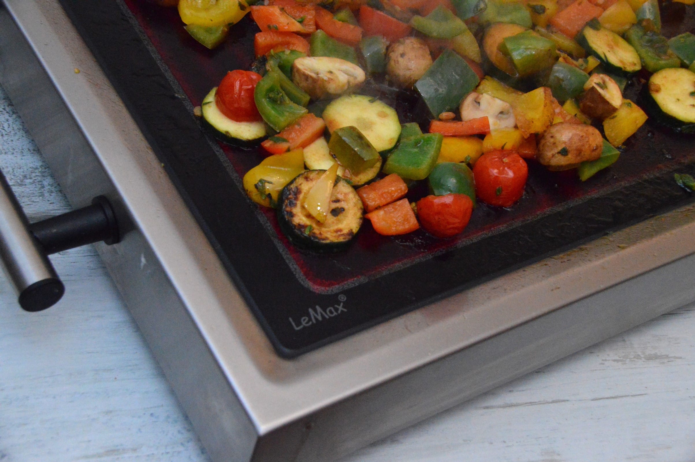 Nach rund einer halben Stunde kann der Grill, die Pfanne, oder in meinem Fall der LeMax Grill aufgeheizt werden. Das Gemüse wird gesalzen und dann für maximal 5 Minuten unter mehrmaligem Wenden gebraten, bis das Bratgut ein paar Röstaromen bekommen hat – Auf dem Grill verwende ich dafür einen solchen Gemüsekorb. Man sollte mit viel Hitze arbeiten, weil das Gemüse bei einer langen Gardauer seinen Biss verliert.